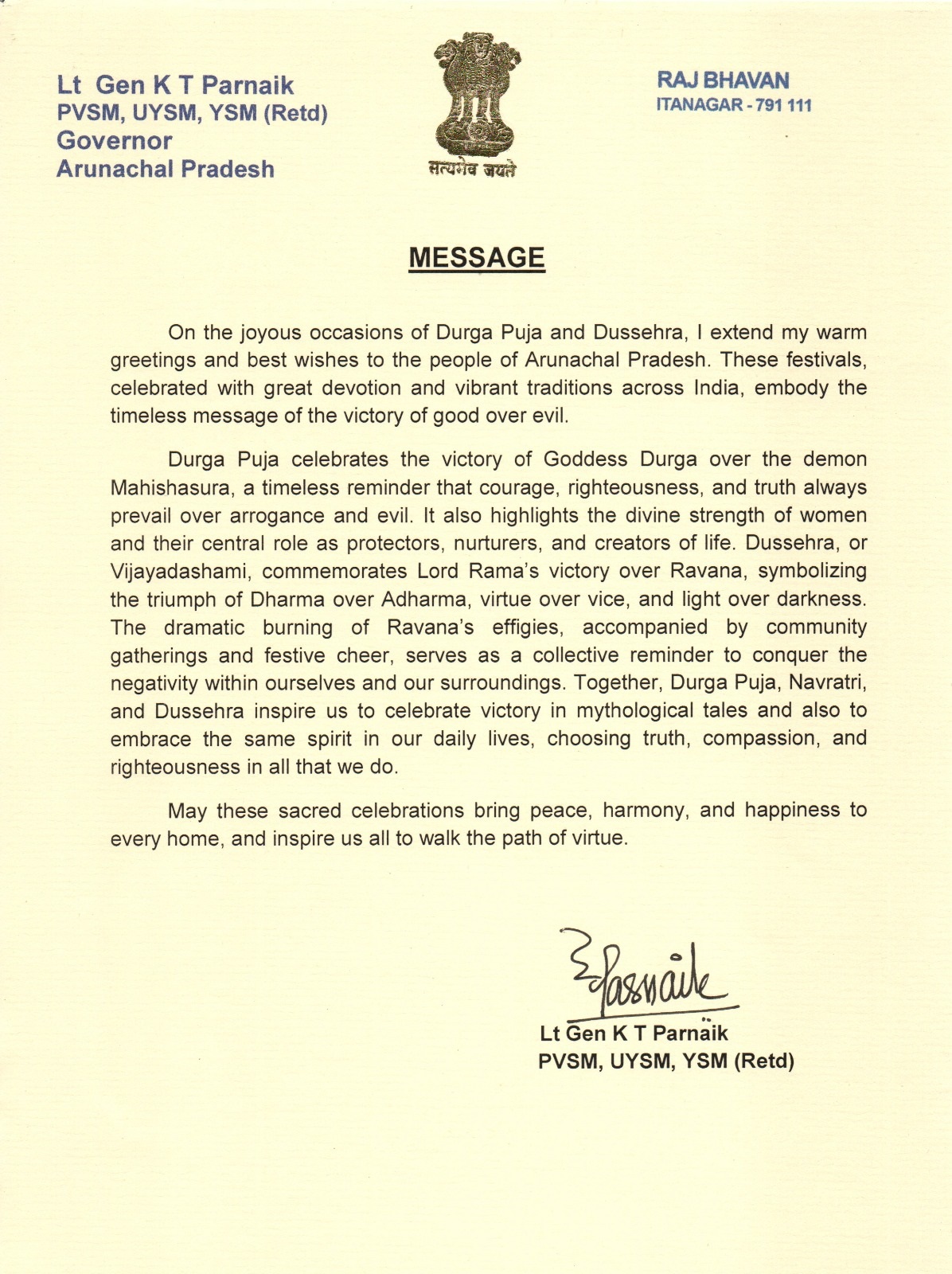 | 29/9/2025 | Governor's message on the occasion of Durga Puja and Dussehra | View |