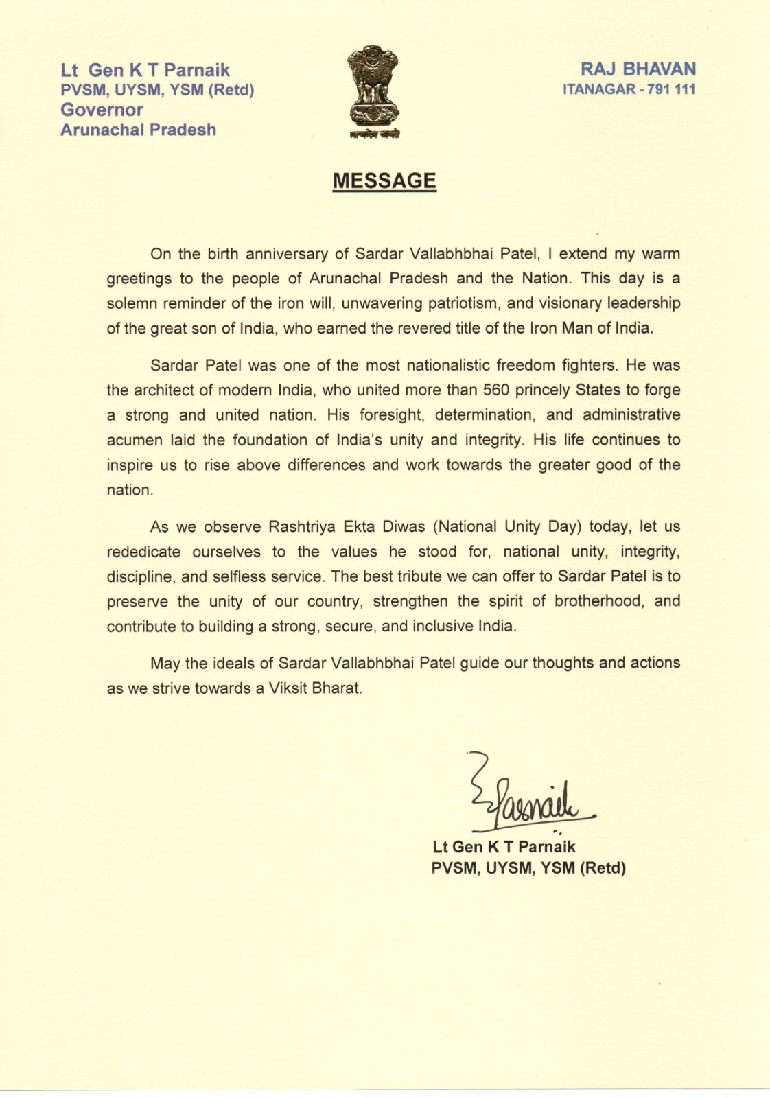 | 31/10/2025 | Governor's message on the Rashtriya Ekta Diwas | View |